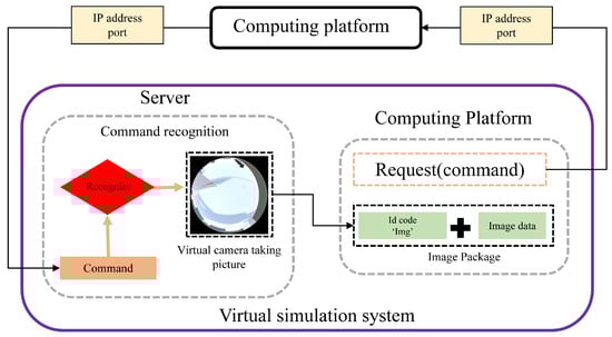 Furthermore, to facilitate real-time cross-platform computational processing of images acquired by the virtual camera, we implemented a TCP-based data reception server and transmission client within the simulation system. The architecture of this setup is illustrated in Figure 2. Under this communication architecture, when the simulation system receives image acquisition commands from external platforms, the images captured by the virtual camera are packaged and loaded into the client module within the simulation system. The client establishes a network connection using the TCP/IP protocol and transmits the data to a target server on the designated external platform. The only required input parameters for this transmission method are the IP address and port number of the destination device, allowing users to easily invoke and customize communication as needed.