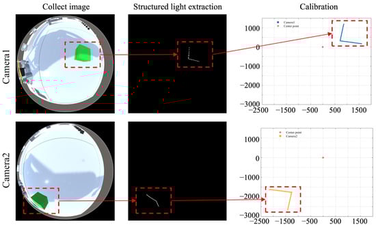 where and represent the coordinates of the fisheye camera within the unified coordinate system, while x and y denote the transformed structured-light coordinates in the same system.