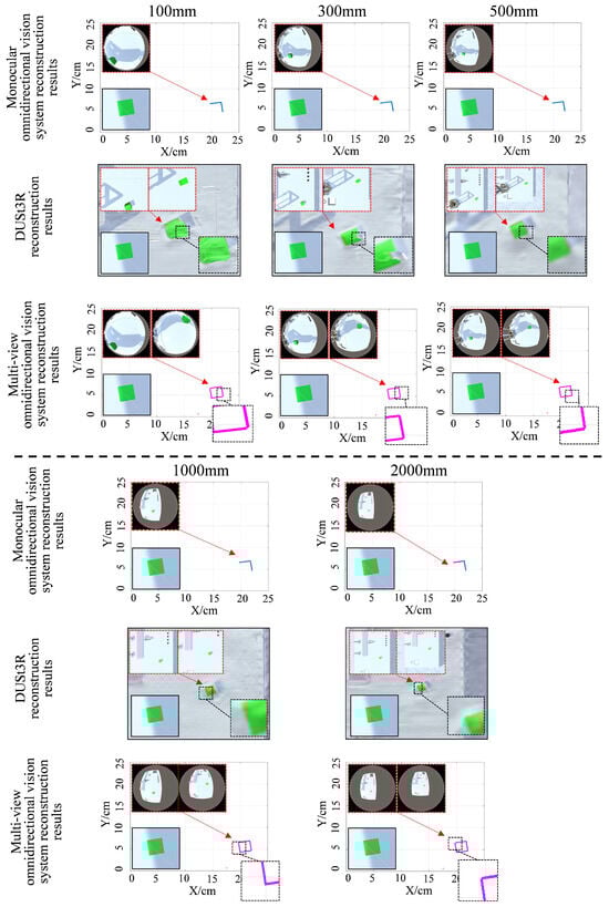 To evaluate the reconstruction performance of the proposed method at varying distances, the omnidirectional vision system was positioned at three heights above the laser plane: 100 mm, 300 mm, and 600 mm. The test object was a cube with a side length of 20 mm. Experimental results obtained using different methods are shown in Figure 5. As illustrated, the dual-view omnidirectional vision system outperforms both the monocular system and DUSt3R, achieving a more complete reconstruction of the target obstacle’s shape. DUSt3R possesses strong global modeling capabilities, allowing it to establish pixel-wise correspondences across the entire image. This enables the reconstruction of all objects within the scene. However, when only two input images are provided, its reconstruction accuracy for smaller objects is limited. At a height of 300 mm, the reconstructed target cube exhibited a noticeable gap.