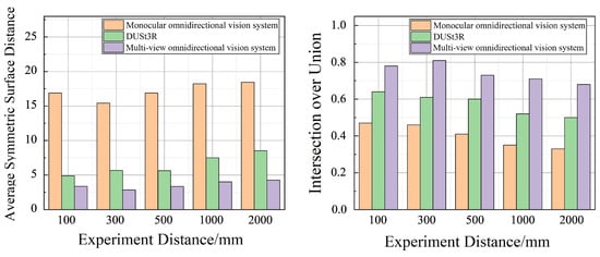 Based on the above equations, the reconstruction accuracy of object shapes for different methods in the tests presented in Figure 5 is quantitatively compared in Figure 6. In reconstruction tests at varying distances, measurement error generally increases as the distance between the camera and the target object increases, resulting in a gradual decline in reconstruction accuracy. However, the multi-view omnidirectional vision system consistently demonstrates significantly higher reconstruction accuracy compared to the monocular system and DUSt3R method. Moreover, it exhibits greater stability in reconstruction performance across different camera heights. Even under long-distance conditions (e.g., 1000 mm and 2000 mm), where DUSt3R shows a marked decrease in reconstruction accuracy due to reduced image detail, the proposed system maintains relatively robust performance by leveraging the wide field of view of the fisheye camera to reliably capture laser information.