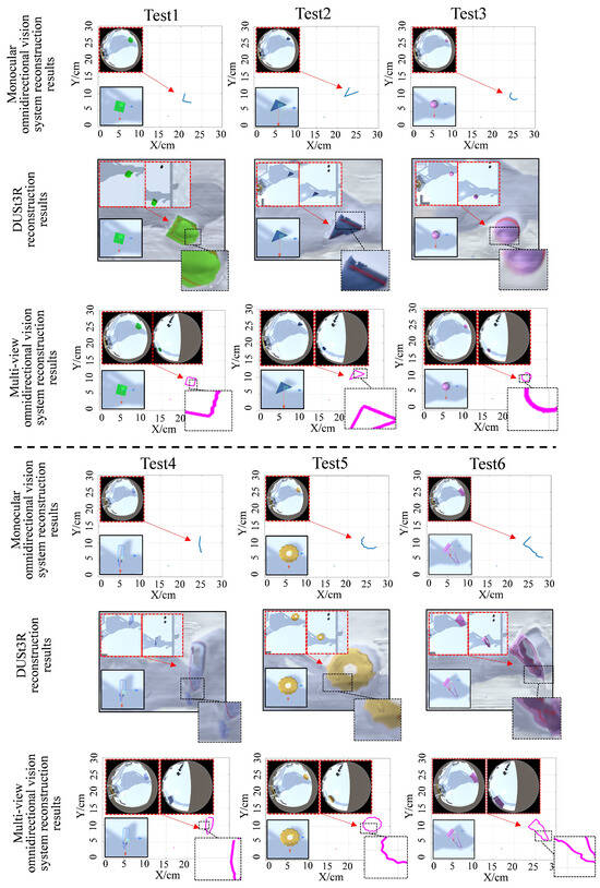 To evaluate the system’s capability in reconstructing objects of various shapes, six models were selected in the virtual testing environment, including three regular-shaped models and three complex curved-surface models. The objects were reconstructed using both the monocular vision systems, the DUSt3R and multi-view omnidirectional vision systems, and the reconstruction results were compared. The experimental results are shown in Figure 7. It can be observed that the monocular omnidirectional system captured limited structured-light data, resulting in only partial reconstruction of the target objects. When dealing with regular geometric shapes, DUSt3R maintains good reconstruction performance, with reconstructed contours closely matching the target object. However, its performance degrades when reconstructing objects with complex curved surfaces. In Test 4, the bottom part of the reconstructed tweezer model was obscured by the background; in Test 5, the gear model exhibited blurred reconstruction in the toothed regions. In contrast, the multi-view omnidirectional system successfully captured structured-light data for both regular and irregular objects, integrated the data, and achieved complete shape reconstruction. Even when reconstructing objects with complex shapes, no significant data loss was observed in the reconstruction results.