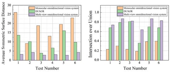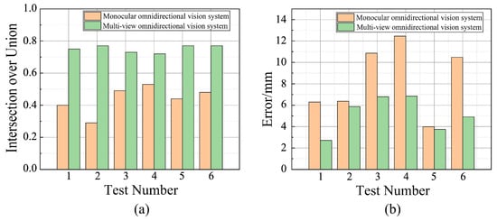 Figure 13a presents the reconstruction accuracy results for both systems in the real-world tests. When reconstructing the target object at different positions, the multi-view system achieved a significantly higher average IoU of 0.752, closely matching the results obtained in the simulation experiments. Figure 13b shows the localization error comparison of the target points for both systems across all experiment groups. In all six experiments, the target point errors computed by the multi-view system were consistently smaller than those from the monocular system. On average, the measurement error was reduced by 38.93% compared to the monocular omnidirectional system. These results demonstrate that in real-world applications, the developed multi-view omnidirectional vision system can effectively enhance reconstruction and localization accuracy, with performance closely aligned to that observed in simulation tests.