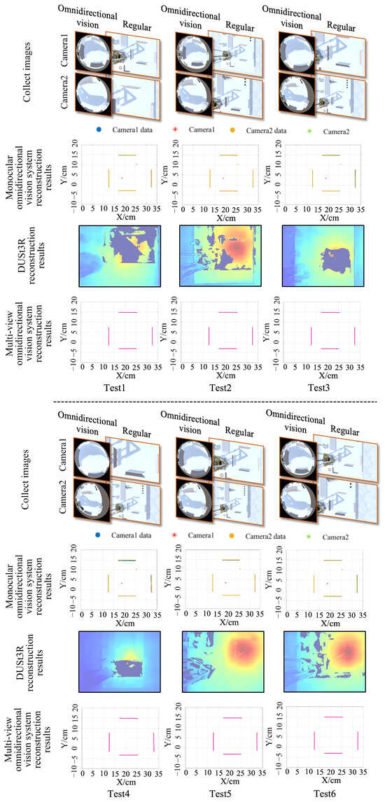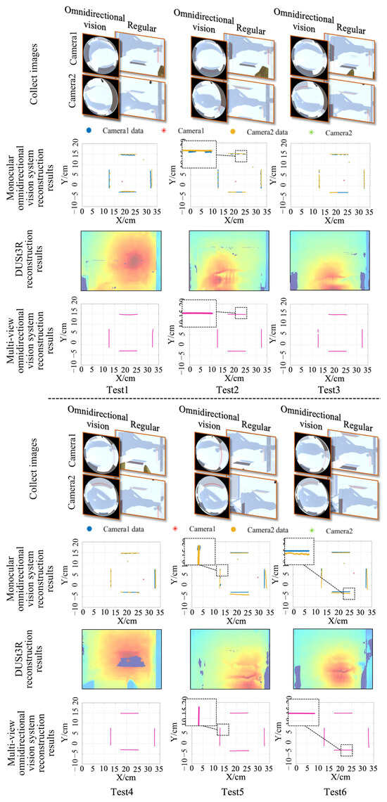 Figure 10 shows the comparison results for the six test groups. Both omnidirectional vision systems successfully reconstructed the structural information of the real obstacles without the data loss previously observed in the monocular system. Although the fixed rotation angles of the two omnidirectional cameras improved DUSt3R’s depth estimation capability, it still failed to recover the depth of the test board. Both omnidirectional vision systems also demonstrated good alignment in the reconstructed data, with no significant structural deviations.
