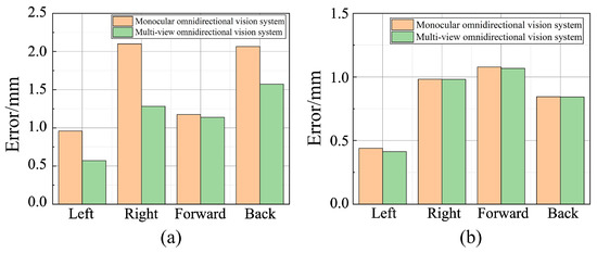 Figure 11a presents the comparison of average distance measurements across six tests using different methods under varying camera positions and rotation angles with a fixed height. In the row of collected images Since DUSt3R failed to estimate the depth of the test board, the comparison was conducted only between the monocular and multi-view omnidirectional vision systems. In all four directions, the multi-view omnidirectional system achieved significantly lower measurement errors. Due to the integration of information from fisheye cameras at different viewpoints, its measurement errors were reduced by 40.4%, 38.9%, 3.1%, and 23.9% in the left, right, forward, and back directions, respectively. Even with randomly changing camera positions, the overall measurement error remained below 1.6 mm, demonstrating the superior robustness of the multi-view omnidirectional vision system. Figure 11b presents the average ranging results in four directions for both omnidirectional vision systems at different camera installation heights with fixed positions and angles. The measurement errors of the two systems were similar in all directions. However, the multi-view omnidirectional system achieved error reductions of 5.88%, 0.08%, 0.93%, and 0.39% in the left, right, front, and rear directions, respectively, compared to the monocular system. These results suggest that the vertical distance between the fisheye camera and the structured-light plane has minimal impact on the reconstruction and ranging accuracy of the multi-view omnidirectional system.