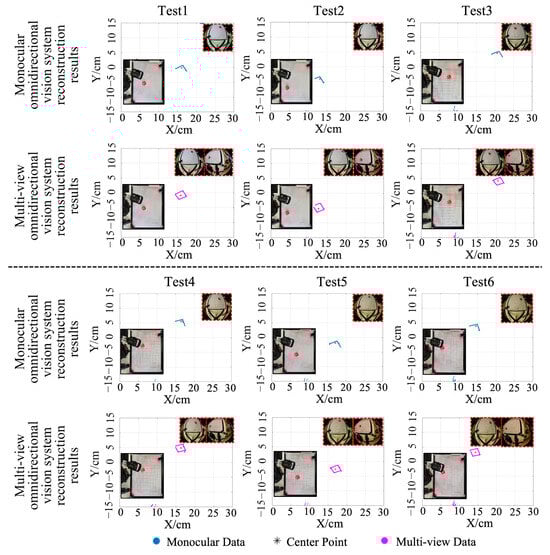 Table 7 provides the ground-truth positions of the cube and the corresponding localization results from both systems. Figure 12 shows the reconstruction results for the cube using the two systems. As observed in the virtual experiments, the monocular omnidirectional system produced incomplete reconstruction due to its limited viewing angle. In this experiment, the view of Camera 1 was limited to the upper portion of the cube, causing the monocular system to significantly overestimate the y coordinate of the object’s position. In contrast, the multi-view omnidirectional system produced x and y coordinate estimates without significant deviation from the ground truth.