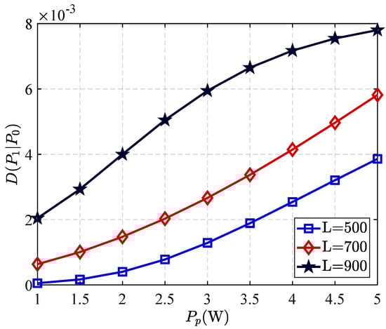 In Figure 4, we present curves for three different block lengths, illustrating the relationship between the primary transmitter’s (PT) transmit power and relative entropy. It is readily apparent that the relative entropy at Willie increases monotonically with increasing PT transmit power. This occurs because higher transmit power enhances the adversary’s (Willie’s) signal observation capability.