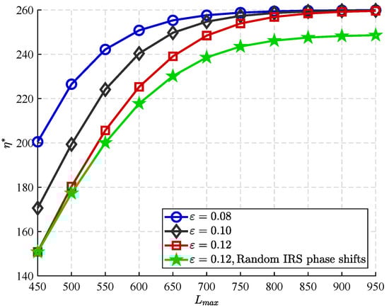 In Figure 5, we present simulation results showing the correlation between the maximum block length constraint and the ECT, as well as the impact of varying covert constraint stringency. It is clear that the ECT increases monotonically with the maximum block length, as longer blocks enhance the statistical distinguishability of the primary transmitter (PT)’s transmitted signal. This improvement in distinguishability increases the probability of Willie detection while also increasing the ECT under the covert constraint. In addition, Figure 5 shows a curve labeled “Random RIS Phase Shifts” to serve as a baseline for validating the proposed optimization strategy. This baseline corresponds to scenarios where RIS phase shifts are randomly generated, simulating unoptimized passive beamforming. By comparing with the proposed scheme, the figure shows the performance gains from active RIS phase alignment, which jointly maximizes the legitimate receiver’s SNR while degrading signal quality at the warden.