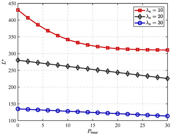 In Figure 6, we show the optimal transmit power and the corresponding optimal block length for different Poisson arrival rates. It is easy to see that the optimal block length decreases monotonically with increasing transmit power. This trend occurs because higher transmit power improves information transmission efficiency, thereby reducing transmission time.