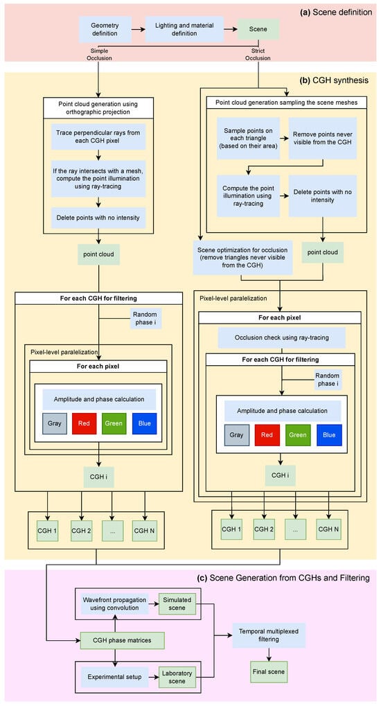 Proposed workflow diagram. (a) The scene is generated using computer graphics techniques. (b) From the scene, N CGHs are computed, with two possible approaches for occlusion handling (strict or simple). (c) Using the N CGHs, the scene is reconstructed either through simulation (using angular spectrum-based propagation techniques) or experimentally in the optics laboratory. Procedures are shown in blue, and results are shown in green.