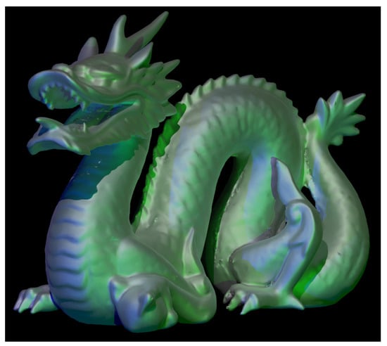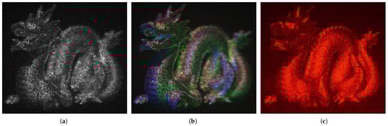 Taking all of these factors into account, a scene image is generated using ray tracing with 128 samples per pixel in 33 s (Figure 2), using the C++ language with gcc-14 compiler running on a Intel i9-9900K CPU, Santa Clara, CA, USA. The scene contains a well known object in computer graphics, the Stanford dragon, because it has a high polygon count. The dragon is illuminated by three point light sources (blue, white, and green) placed on the left, top, and right, respectively. The full image has a resolution of px and mm, which matches both the resolution and the size of the SLM that will later be used in the laboratory [40].