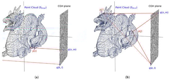 Depending on the size of the CGH, the scene, and the distance between them, a point cloud is generated from a pseudo-orthographic projection of rays (emanating from each pixel of the CGH), with the illumination of each intersection point with the scene geometry computed via ray tracing (Figure 3a). Points with zero intensity can be discarded, as they do not contribute to the CGH. In this way, it can be assumed that all points are visible to all pixels of the CGH. So, to compute the hologram, each point contributes to each pixel of the CGH. This approach allows for the accurate inclusion of the scene depth, although it does not account for strict parallax effects. Nevertheless, it can be useful in scenes where parallax is not the dominant effect (for instance, when the scene size is comparable to that of the CGH).