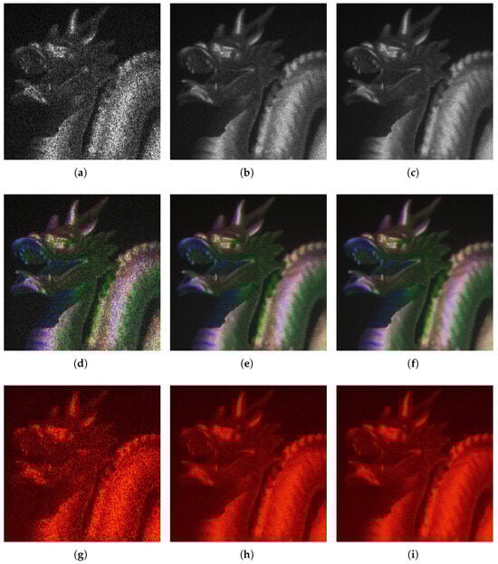 Figure 4b shows the result of computing three CGHs at different wavelengths to produce a final color image ( µm, µm, µm), corresponding respectively to HeNe, DPSS, and He-Cd lasers [44]. The color image is obtained by temporal multiplexing of these three CGHs, illuminated with the same wavelengths used for phase calculation.