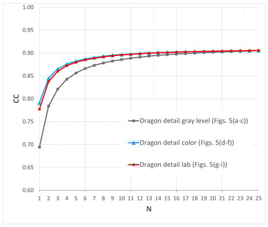 Figure 6 shows the behavior of the Correlation Coefficient (CC) as the number of images used for filtering increases, both for CGHs computed in grayscale (gray lines), and for those computed in color (blue lines) and lab scenes (red lines). In this plot, the CC exhibits a clearly asymptotic behavior, allowing designers to select the number of CGHs needed to improve an image without compromising the final quality. Several factors prevent the CC from reaching a value of one. The most important is related to how the reconstructed scenes are captured: to highlight the depth effect of the CGHs, only a single object plane (coinciding with the dragon’s head) is fully in focus. As one moves away from this plane, a defocusing effect appears, which affects the image used for comparison with the original scene.