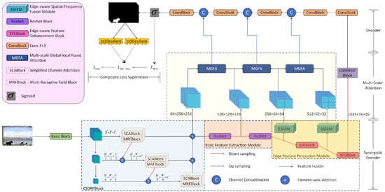 The overall architecture of the proposed AMSEANet. The network follows a standard encoder–decoder structure, incorporating three main innovative modules: the Cross-Scale Dense Residual Fusion Block (CSDRFBlock) for multi-scale feature enhancement, the Edge-Aware Spatial-Frequency Fusion Module (ESFFM) for guided trace perception, and the MGFA mechanism in the skip connections.