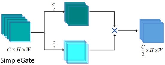 SimpleGate is a lightweight yet efficient non-linear feature transformation module. Its core idea is to achieve adaptive feature modulation through channel splitting and element-wise multiplication (Hadamard product). As illustrated in Figure 5, given an input feature tensor , where B represents the batch size, C is the number of channels, and H and W represent the spatial height and width, respectively, x is first split into two equal sub-tensors along the channel dimension: .