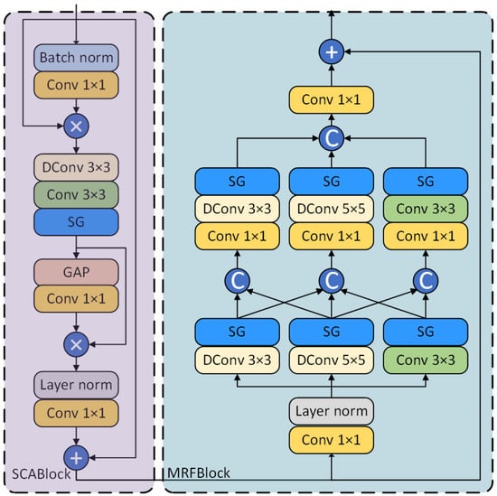 The architecture of the proposed Simplified Channel Attention Block (SCABlock) and the Multi-Receptive Field Block (MRFBlock).