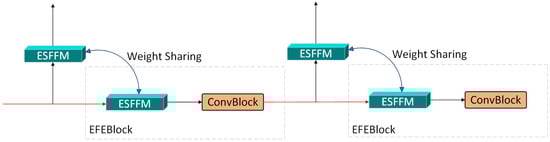 The architecture of the Edge-Aware Feature Enhancement Block (EFEBlock). The block is composed of two ESFFM modules and a ConvBlock in series, with a weight-sharing strategy applied between corresponding modules.