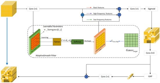 where is the identity operator, and is the complementary, implicitly learned adaptive high-pass filtering operator to . To ensure the smoothing kernel learned by the Adaptive Smooth Filter is robust and possesses favorable mathematical properties, we introduce an optional regularization term. This regularization term guides the learning by minimizing the mean squared error between the learned effective smoothing kernel and a predefined target Gaussian kernel (with a standard deviation of ):