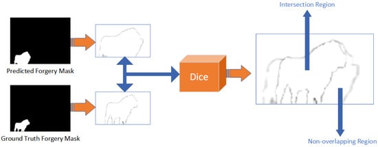 Diagram illustrating the principle of the traditional Dice loss function. The method measures the quality of a segmentation result by comparing the Predicted Forgery Mask and the Ground Truth Forgery Mask based on their intersection and non-overlapping regions.