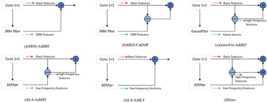 To effectively capture and enhance these indicative edge features, and to fully leverage information from different frequency domains, we have designed the ESFFM. As illustrated in Figure 8, the core of this module lies in the introduction of a learnable ASF, which dynamically decomposes the input features into their low-frequency (smooth) and high-frequency (detail) components based on the data. Subsequently, these separated components are combined with the original feature information and refined through subsequent convolutional and attention mechanisms, thereby achieving a comprehensive enhancement of the indicative edge tampering features.