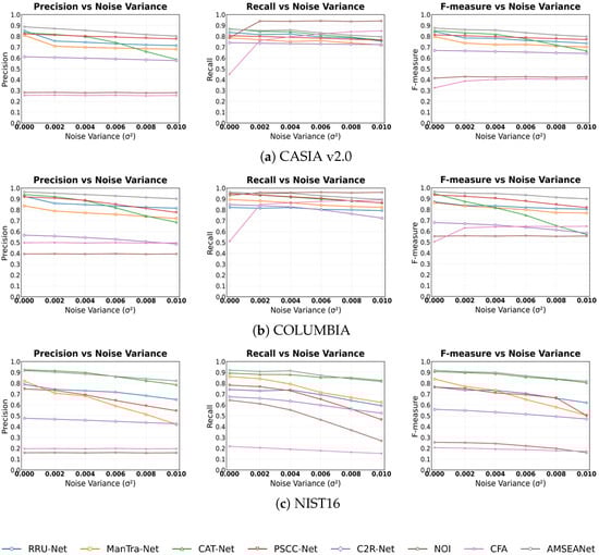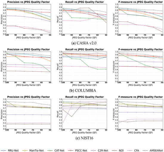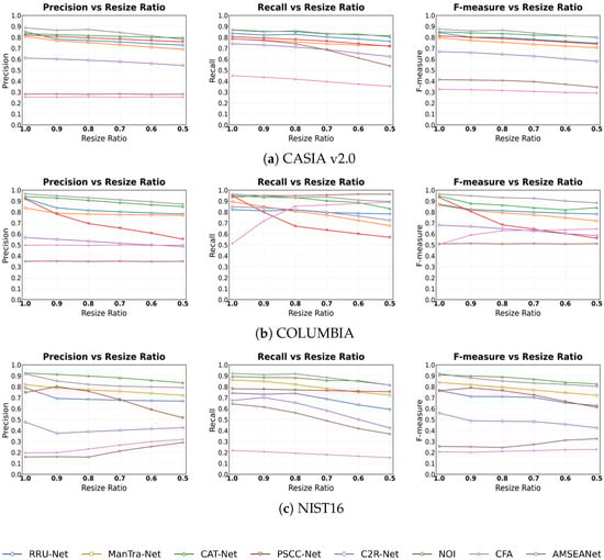 Comparison results under resize operation attack. The three columns represent Precision, Recall, and F-measure, respectively. (a–c) show the experiment results on the CASIA v2.0, COLUMBIA, and NIST16 datasets, respectively.
