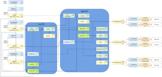 Structure of the GD mechanism. The GD mechanism enhances the model’s ability to detect objects of varying sizes by constructing two dedicated branches: the Low-Stage Gather-and-Distribute Branch (Low-GD) and the High-Stage Gather-and-Distribute Branch (High-GD).