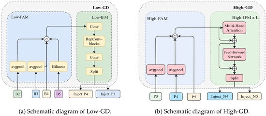 To effectively address the problem of information loss in traditional Feature Pyramid Networks (FPNs) during feature transmission, we introduce the Gather-and-Distribute (GD) mechanism, as shown in Figure 2. This mechanism employs a unified module to aggregate and fuse multi-level features, then redistributes the fused results back to each layer [47]. By doing so, it mitigates the inherent information loss of conventional methods while enhancing the feature integration capability of the neck, without introducing significant latency. Consequently, this approach enables more efficient utilization of backbone-extracted features and can be conveniently embedded into any existing backbone–neck–head architecture.