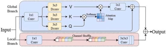 Module diagram of the attention and convolution fusion between the local branch and the global branch. The former specializes in efficiently extracting local details and facilitating inter-channel interactions, while the latter focuses on modeling long-range feature dependencies and capturing global spatial relationships.