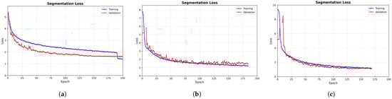 Segmentation loss curves during training. Blue: training; red: validation. Both losses converge smoothly, indicating effective model training. Note that training on the Kvasir-SEG and CVC-ClinicDB datasets was terminated around epoch 175 due to the early stopping criterion. (a) Loss trend observed on the PolypDB dataset. (b) Loss trend observed on the Kvasir-SEG dataset. (c) Loss trend observed on the CVC-ClinicDB dataset.