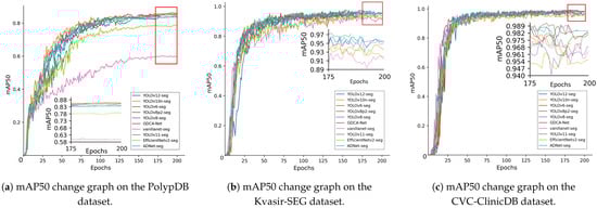 We initially performed a grid search on a subset of the PolypDB dataset to identify the optimal initial parameters, which were subsequently validated on two additional datasets. The results demonstrate that the configuration (learning rate: 0.01; batch size: 16; epochs: 200; input size: 640 × 640) achieved stable IoU convergence across all datasets (as shown in Figure 5), confirming its robustness and generalization capability. Ultimately, this unified hyperparameter setup ensured that all experiments were conducted under identical conditions, thereby guaranteeing the fairness and credibility of the performance comparison.