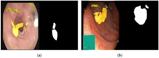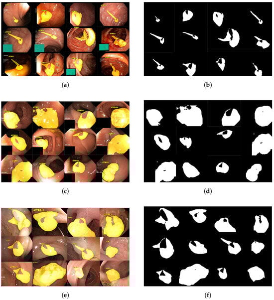 - Jha, D.; Smedsrud, P.H.; Riegler, M.A.; Halvorsen, P.; De Lange, T.; Johansen, D.; Johansen, H.D. Kvasir-seg: A segmented polyp dataset. In Proceedings of the International Conference on Multimedia Modeling, Daejeon, Republic of Korea, 5–8 January 2020; Springer: Cham, Switzerland, 2019; pp. 451–462. [Google Scholar]