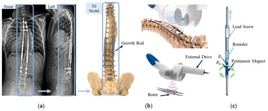 When EOS becomes severe and continues to progress, surgical intervention with single or dual expandable growth rods is typically required. These rods are anchored to the upper thoracic and lower lumbar regions of the spine to provide corrective traction along the spinal axis. Among various configurations, dual-rod constructs offer superior biomechanical stability and greater deformity correction, thereby reducing the likelihood of rod fracture or implant failure. The MAGEC system allows non-invasive adjustment of spinal rods through an external magnetic actuator. Figure 1a shows an X-ray of a patient with dual magnetically controlled growing rods. Figure 1b depicts the external magnetic drive system, which incorporates two identical, axially rotating permanent magnets that generate a rotating magnetic field. This field induces torque in a rotor located within the implanted rod. The torque is amplified through a mechanical conversion mechanism and translated into axial displacement, enabling the rod to either elongate or retract, as schematically illustrated in Figure 1c.