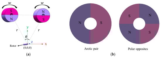 Both the rotor and the driving magnets were radially magnetized. The number of poles was set to twice the number of pole pairs, ensuring symmetrical pole distribution. Radial magnetization directs the magnetic field lines outward from the magnet center, promoting efficient interaction with the rotor.