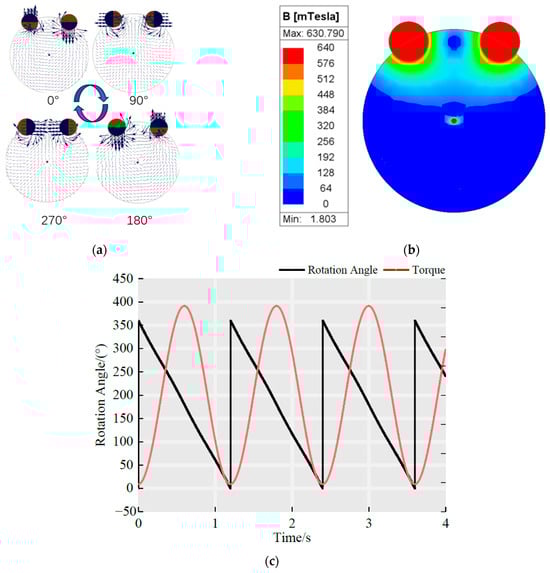 Simulation results of the driving permanent magnet-rotor model: (a) Distribution of magnetic field lines; (b) Distribution of magnetic field intensity; (c) Time-dependent variation of rotor torque.