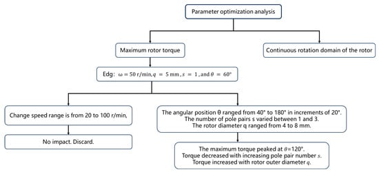Further simulations were performed to analyze the influence of different design parameters. Among them, the optimization process of the optimization method is shown in Figure 4, and the process of the numerical simulation is shown in Figure 5. The angular position ranged from 40° to 180° in increments of 20°. The number of pole pairs varied between 1 and 3, the rotor diameter ranged from 4 to 8 mm, and the rotation speed was varied from 20 to 100 r/min. Results, shown in Figure 6, revealed that: The maximum torque peaked at . Torque decreased with increasing pole pair number . Torque increased with rotor outer diameter . Torque was largely unaffected by changes in rotation speed .