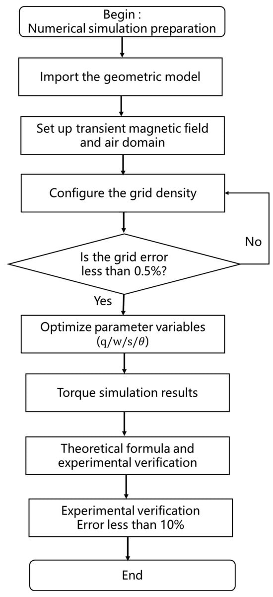 The flowchart of the experimental design is shown in Figure 9.To validate the simulation results, a rotor torque testing system was developed, as shown in Figure 10. In this setup, a motor was connected to a transmission shaft through a flexible coupling. The opposite end of the shaft was bolted to a gear assembly, which synchronously drove two permanent magnets via meshed gears—this configuration ensured that the magnets rotated in unison, thereby replicating the actuation conditions of magnetic control systems. A torque sensor was used to directly measure the output torque of the rotor; the sensor was mounted securely with a combination of set screws, locking blocks, and high-rigidity couplings to minimize mechanical interference. The rotor, screw rod, and collet were all fixed to the torque sensor through coaxial couplings, ensuring concentricity between the rotor and the sensor to guarantee stable and high-precision data acquisition. This system allowed direct, real-time measurement of rotor torque under both pre- and post-optimization configurations. Notably, the torque data obtained from this high-accuracy torque sensor served as the gold standard for validating the reliability of the ANSYS Maxwell simulation model, as it provided objective, in vitro measurement results that directly reflected the actual torque output of the magnetic actuation system.