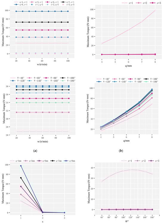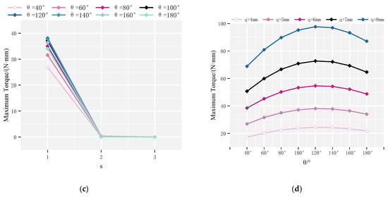 Effects of design parameters on maximum rotor torque: (a) Torque variation with under different and ; (b) Torque variation with under different and ; (c) Torque variation with under different and ; (d) Torque variation with under different and .