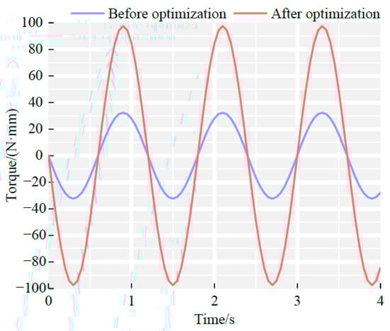 To quantitatively assess the improvement achieved by parameter optimization, a comparative torque analysis was performed before and after optimization, as shown in Figure 8. The optimized configuration was defined as: = 120°, = 1, = 8 mm, and = 50 r/min. All other simulations were held constant. As shown in Figure 6, the maximum torque of the pre-optimization rotor was 32.847 , while the optimized rotor achieved a maximum torque of 98.970 , representing a 201% increase.