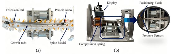 Growing rod experimental apparatus: (a) Growing rod extension setup; (b) Distraction force measurement test rig and pressure sensor module for distraction experiments.