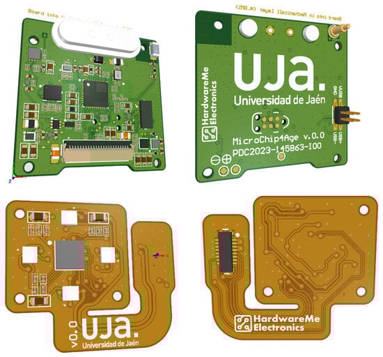 The wristband integrates two interconnected PCBs: a flexible section and a main rigid board. The flexible board measures 20.65 mm × 17.65 mm, with a two-layer stack-up fully dedicated to signal routing. It hosts 19 components in total, of which 18 are mounted on the top side and only one on the bottom, Table 2 and Table 3. This section is intended to allow the integration of the biometric sensor, adapting to the curvature of the wrist.