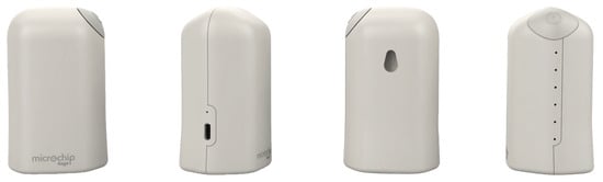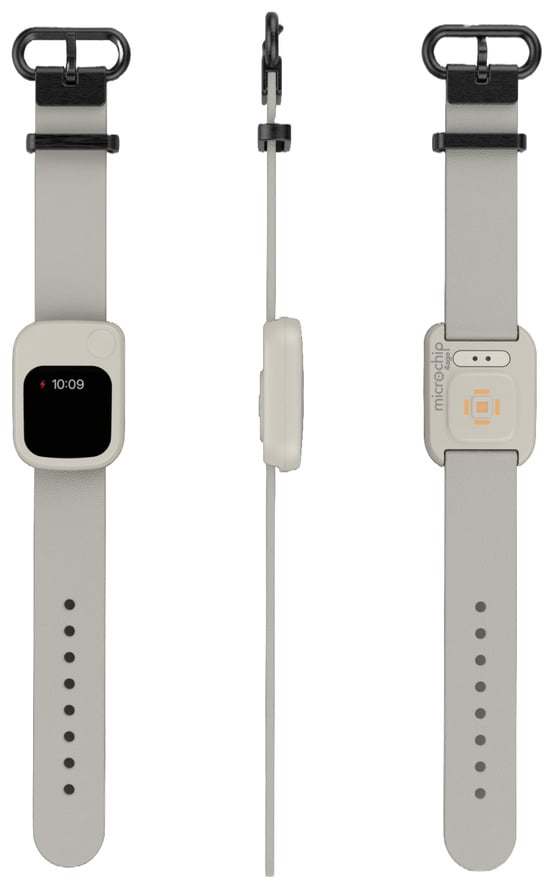 After several iterations and usability tests, the horizontal design was chosen, as it offered better integration with the wrist’s natural shape and allowed for a suitable balance between screen area, device size, and sensor accessibility, as shown in Figure 2. This decision also reduced the necessary curvature of the electronic module, improving sealing and simplifying manufacturing.
