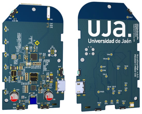 The following subsection presents the layout and component selection of the wristband’s PCB. Special attention is given to energy efficiency, sensor integration, and support for firmware updates over-the-air (OTA), ensuring that the device meets the functional requirements of a personalized, adaptive, and transparent monitoring system.