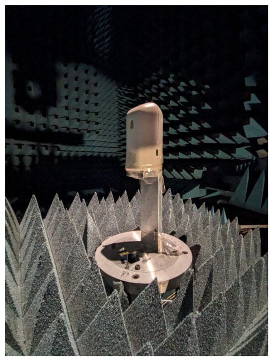 A preliminary experiment was conducted to compare the signal stability of the proposed ASIA Beacon against a commercial iBKS 105 device. Both beacons were placed under controlled conditions in an anechoic chamber (Figure 8), and the RSSI was recorded using a Samsung smartphone as receiver. The tests were carried out in the Anechoic Chamber of the Radiofrequency and Antennas Laboratory at the University of Valencia, one of the largest and most sophisticated facilities of its kind in Spain. This 5.5 × 8.5 × 5.5 m installation enables high-precision measurements in interference-free environments, which are essential to validate the performance of the indoor positioning system. The walls are covered with absorbent panels, which consist of pyramids of absorbent material that are 50 cm high in the central area of the walls. These panels reflect between −45 and −50 dB of the incident radiation at the devices’ frequencies. The Orbit/FR positioners (https://www.mvg-world.com/es/orbit-fr (accessed on 12 October 2025)) also allow the devices to be precisely positioned inside the chamber with the AL-48062 Positioning Controller. This facility allows the characterization of antennas and wireless sensing devices from 300 MHz up to 110 GHz, supporting both far-field spherical and near-field planar measurements, thus providing an ideal environment for controlled validation. Moreover, the controlled conditions of the chamber make it possible to analyze multipath propagation effects and frequency-dependent attenuation in a reproducible manner—factors that are critical for evaluating BLE-based positioning systems, where even small variations in RSSI can compromise localization stability. The use of this facility, therefore, provides a reliable baseline for comparing the behavior of commercial and custom-developed beacons. In this setup, the ASIA Beacon was configured to transmit exclusively on a single advertising channel (ch. 37), whereas the iBKS 105 operated in its default mode, cycling across all three advertising channels (ch. 37–39). Table 13 summarizes one representative dataset of the ongoing tests.