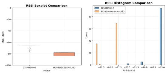 As observed, the iBKS 105 exhibited a significantly weaker average signal (approximately 15 dB lower) and higher variability compared to the ASIA Beacon. The boxplot and histogram analysis (Figure 9) confirm that the proposed beacon achieves a more concentrated distribution of RSSI values, thus providing greater stability for localization purposes.
