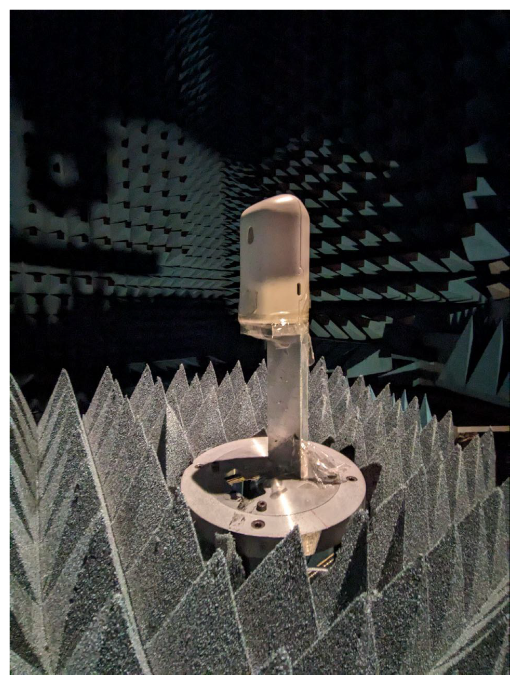 Figure 8), and the RSSI was recorded using a Samsung smartphone as receiver. The tests were carried out in the Anechoic Chamber of the Radiofrequency and Antennas Laboratory at the University of Valencia, one of the largest and most sophisticated facilities of its kind in Spain. This 5.5 × 8.5 × 5.5 m installation enables high-precision measurements in interference-free environments, which are essential to validate the performance of the indoor positioning system. The walls are covered with absorbent panels, which consist of pyramids of absorbent material that are 50 cm high in the central area of the walls. These panels reflect between −45 and −50 dB of the incident radiation at the devices’ frequencies. The Orbit/FR positioners (