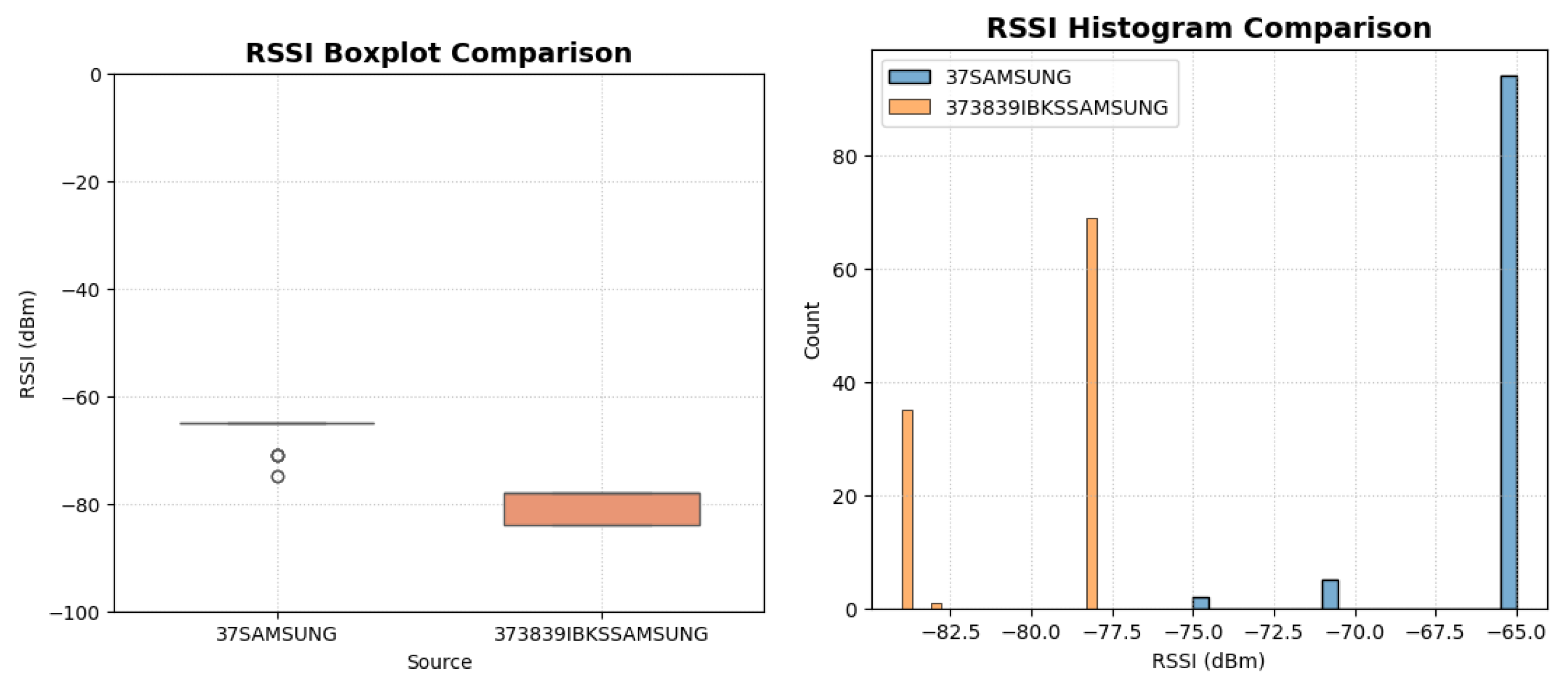 As observed, the iBKS 105 exhibited a significantly weaker average signal (approximately 15 dB lower) and higher variability compared to the ASIA Beacon. The boxplot and histogram analysis (