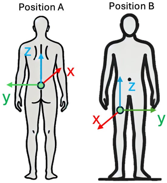 FARSEEING [31] is a dataset that contains real-world falls. The authors claimed that they have collected more than 300 real-world falls from January 2012 to December 2015. Unfortunately, there are only 22 verified falls records that have been released. These data were collected from 15 subjects, aged from 56 to 86. The data were collected in a rehabilitation clinic or at home. The sensors were located at lower back (Position A) or thigh (Position B), as shown in Figure 3. They used two types of devices to collect acceleration data, which results in data collected in two ranges— and . Concretely, 7 examples are in and 15 are in .