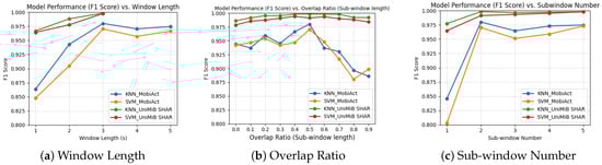 The preliminary experiments were conducted to quantify the contribution of each key design choice—namely window length, sub-window number, and sub-window overlap ratio (sub-window length)—to the overall performance. All reported results are based on 10-fold cross-validation.