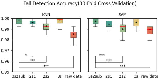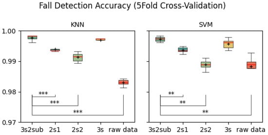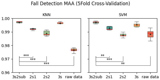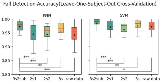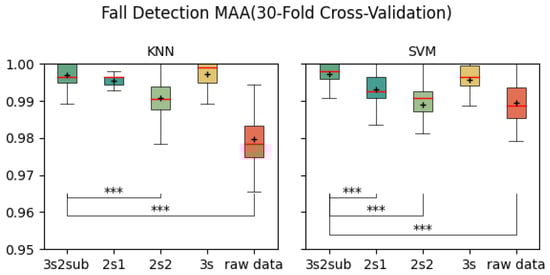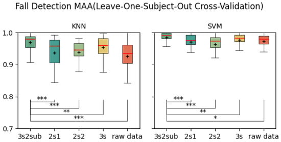 In both 5-Fold and 30-Fold Cross-Validation, 3s2sub outperformed all the control groups. Notably, there was a significant difference between 3s2sub and the 2s1, 2s2, and Raw Data groups; 3s2sub was considered the most effective among them. Here, we attempt to prove whether separating the window into two sub-windows makes sense or not. In Figure 5, Figure 6, Figure 8, and Figure 9, although there is no significant difference between 3s2sub and 3s, 3s2sub has shorter boxes, meaning the test result distribution is more concentrated, so we believe that 3s2sub is more stable than 3s in these cases. In practice, we hope to reduce user operation; in other words, we hope the FDS does not need to collect data from users and be further retrained. As indicated by the results of the LOSO Cross-Validation, there is a significant difference between 3s2sub and 3s at the 0.1% level, so we believe that 3s2sub can detect falls from unseen users more effectively. Additionally, the result distribution of 3s2sub is more concentrated, so it is more stable. Overall, comparing the results between 3s2sub and 3s, we can conclude that 3s2sub is more effective than 3s. Thus, it makes sense to divide the window into two sub-windows. Beyond 3s2sub, we have tested 3s3sub (divide the 3 s window into three 1.5 s sub-windows and set the overlap between adjacent sub-windows to 50%). The results are not shown, because in 5-fold, 30-fold, and LOSO cross-validation there is no significant difference in T-test. Thus, we believe it is not necessary to divide the whole window into three sub-windows because it increases computational complexity.
