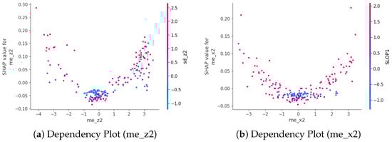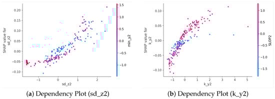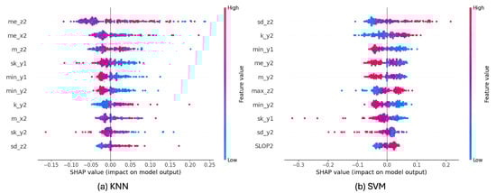SHAP-based interpretability analysis clarifies how the model utilizes the extracted features to make decisions. Bees warm plot revealed top-10 features. For KNN and SVM classifier, the features contribute differently. Dependency graph analysis revealed strong feature interactions—for example, between me_z2 and sd_z2, me_x2 and SLOP1 in the KNN model, and between sd_z2 and min_y2, k_y2 and SLOP2 in the SVM model—indicating that the combined effects of variability and central tendency in specific motion directions are crucial for distinguishing falls from ADLs.